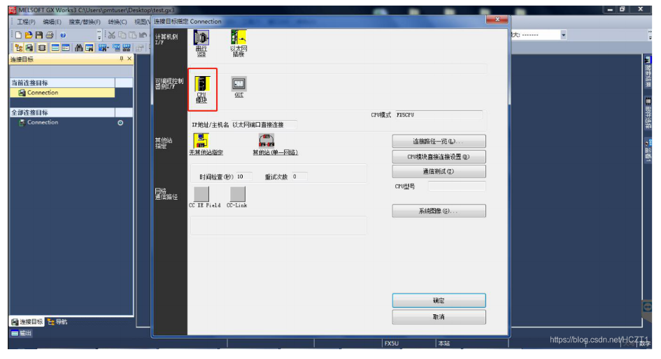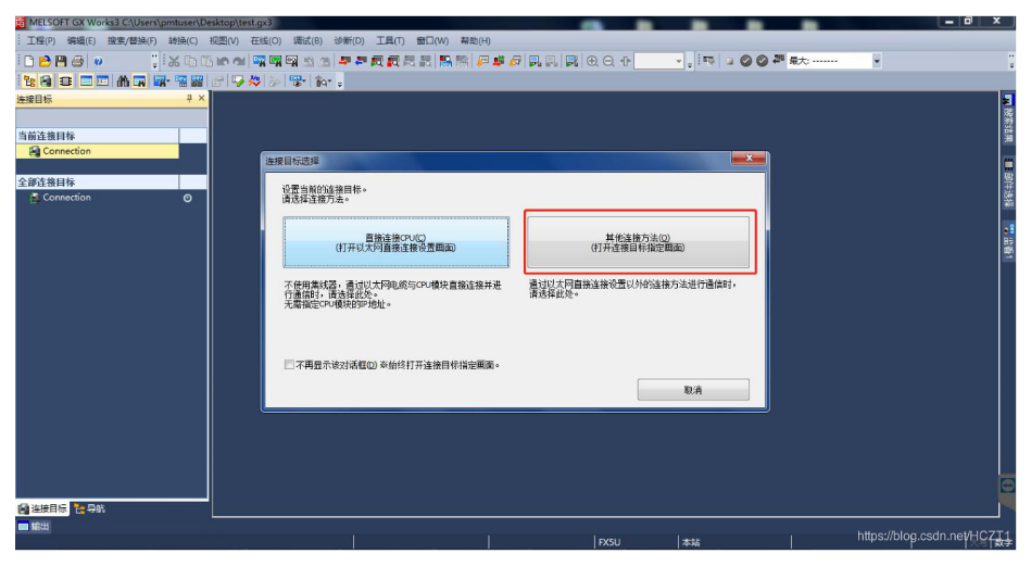 打開GXWORKS 3,點(diǎn)擊當(dāng)前連接目標(biāo)下的【Connetion】,連接目標(biāo)選擇【其他連接方式】