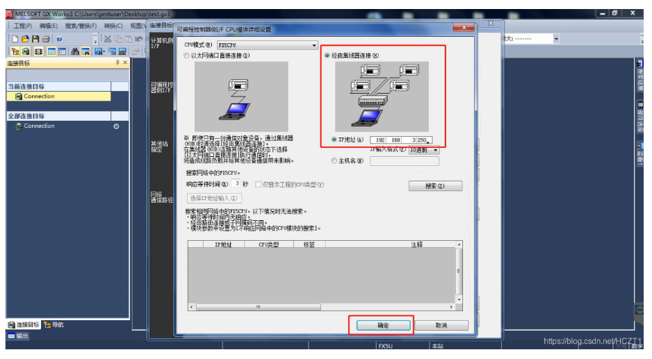 選擇【經(jīng)由集線器連接】,輸入PLC的IP地址后點(diǎn)擊【確定】。