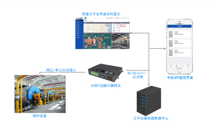 華辰智通為您提供專業(yè)的工業(yè)鍋爐遠(yuǎn)程監(jiān)控方案,可以實(shí)現(xiàn)廠家遠(yuǎn)程監(jiān)控設(shè)備,監(jiān)控設(shè)備的數(shù)據(jù),及時(shí)了解設(shè)備的運(yùn)行故障狀態(tài),改善廠家的售后服務(wù)、技術(shù)研發(fā)等環(huán)節(jié)。華辰智通工業(yè)鍋爐遠(yuǎn)程監(jiān)控方案由三部分組成:鍋爐設(shè)備、HINET邊緣計(jì)算網(wǎng)關(guān)、思普云平臺(tái)。HINET邊緣計(jì)算網(wǎng)關(guān)和鍋爐設(shè)備連接后,再把采集到的實(shí)時(shí)數(shù)據(jù)通過(guò)4G/WIFE/以太網(wǎng)絡(luò)等方式傳送到思普云平臺(tái)。由于無(wú)線傳輸不受距離的限制,多個(gè)無(wú)線可同時(shí)連接到一個(gè)監(jiān)控中心,因此一個(gè)監(jiān)控中心可以檢測(cè)多個(gè)鍋爐設(shè)備。思普云平臺(tái)主要負(fù)責(zé)處理每個(gè)鍋爐發(fā)送過(guò)來(lái)的數(shù)據(jù),并在電腦上和手機(jī)APP端實(shí)時(shí)顯示。這樣,利用工業(yè)物聯(lián)網(wǎng)技術(shù)來(lái)降低運(yùn)維成本,提升企業(yè)管理水平。