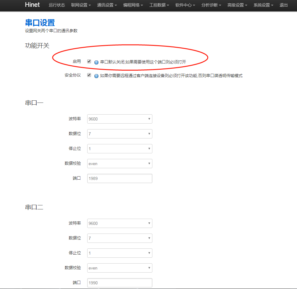 1. 網(wǎng)關串口功能是否開啟,進網(wǎng)關后臺,點擊“通訊設置 - 串口設置”,串口勾選【啟用】。